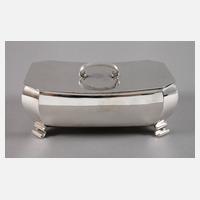 um 1930, gestempelt Halbmond, Krone, 925, Herstellermarke Koch & Bergfeld Bremen, Modellnummer 900 586, gewölbte facettierte Ecken, eingerollte Füße, nach unten gewölbter Deckel mit gerilltem Griff, guter Originalzustand, L 21 cm, G ca. 695 g.