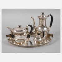 um 1915, gestempelt Halbmond, Krone, 800 und Herstellermarke, Modellnummer 12017, Vertriebsstempel H., seitlich scharnierte Klappdeckel, Griffe aus Ebenholz, gewölbte Ovalformen, mit Ornamentbändern verziert, bestehend aus Kernstück mit zusätzlicher Teekanne auf passendem Tablett, ein Henkel geklebt, ein Deckelknauf fehlt, G zusammen ca. 2812 g.