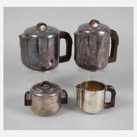 1930er Jahre, Metall versilbert und anlaufgeschützt, Ebenholzgriffe, innen zum Teil Reste alter Vergoldung, Kernstück mit zusätzlicher Teekanne, Gebrauchsspuren, H max. 20 cm.