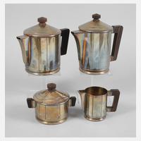 Frankreich, um 1930, Kleeblattmarke RD, vermutlich Louis Ravinet & Charles Denfert Paris, Metall versilbert, teilweise innen vergoldet, rückseitig scharnierte Klappdeckel an den Kannen, Palisandergriffe, normale Altersspuren, H max. 17 cm.