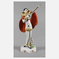 Entwurf 1920er Jahre, undeutliche braune Stempelmarke, geritzte Modellnummer 247? und Entwerfersignatur L. Levemann?, Porzellan, naturalistische Ausformung mit farbenfroher Aufglasurbemalung und Goldstaffage, auf siebeneckigem Sockel mit abstrahierter Stütze stehender junger Mann im Kostüm, singend eine Laute spielend, Farbe partiell berieben und Instrumentenspitze restauriert, H 27,5 cm.