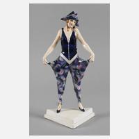 Entwurf Stephan Dakon 1927, signiert, schwarze Stempelmarke mit Schriftzug: "hand dekorated made in Austria", ligiertes Malermonogramm, Modellnummer 5658, stehende junge Dame im Karnevalskostüm (eventuell Lissi Arna?), Steingut farbig bemalt und farblos glasiert, Hut und am Sockel fachgerecht restauriert, H 33 cm.