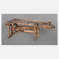 1920er Jahre, Platte und das Gestell jeweils mit Brandstempel, gemarkt W. Dünnebeil Weimar Nummer 2, Buche, massiv, zweiteiliger Korpus mit zwei Schraubzwingen und breiter Ablage, funktionstüchtig, Alters- und Gebrauchsspuren, Maße 81 x 225 x 105 cm. Info: Die Schreinerei Dünnebeil war an der Ausstattung des Schiller-Gymnasiums in Weimar maßgeblich beteiligt (errichtet 1927-36 in zwei Bauphasen). Die Hobelbank war in der Ausstellung „bauhaus - form & reform“ im Landesmuseum Mainz anlässlich des 100. Jubiläums des Bauhauses ausgestellt.