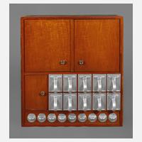 Entwurf Margarete Schütte-Lihotzky 1926, Wandschrank aus Tischlerplatte, dreitürig, mit zehn Schütten aus Aluminiumblech und neun Vorratsgefäßen mit Glaskorpus, gemarkt "Original Haarer Hanau", die Seitenwände später aufgedoppelt, Alters- und Gebrauchsspuren, H 88 x B 82 x T 25 cm.