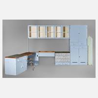 Ausführung Grumbach, für das städtische Hochbauamt Frankfurt, Weichholz-Rahmenkonstruktion, taubenblau lackiert, verschiedene Holzarten, in der ursprünglichen blauen Farbfassung rekonstruiert und teils restauriert, mit originalem Gusseisen-Doppelspülbecken, allen Schränken, Arbeitsplatte sowie Alu- und Holzschütten vorhanden, Höhe ca. 215 cm. Info: Exemplar einer originalen Frankfurter Küche aus der Ernst May-Siedlung Römerstadt, Frankfurt. Gesamtplanung: Ernst May, Herbert Brehm und Wolfgang Banger. "Abteilung Typisierung" des städtischen Hochbauamtes Frankfurt, u. a. zuständig für die Entwicklung der Frankfurter Küche: Margarete Schütte-Lihotzky.