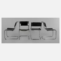 Modell 251, Entwurf Mies van der Rohe 1929, Ausführung wohl Knoll International, 1960er Jahre, vierteiliges verschraubtes Gestell aus verchromtem Bandstahl, Auflagen und Bespannung aus schwarzem Leder, ein Sitzkissen mit Einriss, das andere bereits alt repariert, Maße je 37 x 55 x 57 cm.