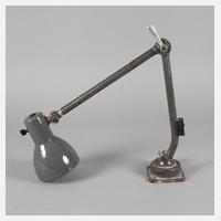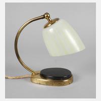 1960er Jahre, Ausführung GMF Gotha, vergoldetes Messinggestell, der ovale Fuß mit großer Taste aus geschwärztem Kunststoff, c-förmiger Leuchterarm, variabel neigbarer Schirm aus streifig grün überfangenem, satiniertem Klarglas, einflammig, alt elektrifiziert, Alters- und Gebrauchsspuren, H 25 cm.