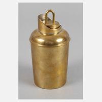 Bauhochschule Weimar 1926/30 oder Walther & Wagner, Schleiz, Messing gedrückt, innen verzinnt, ungemarkt, abnehmbarer Deckel mit gebogtem Ösenhenkel, an der Schulter eine umlaufende Wulst, etwas gedellt, H 14 cm. Lit. vgl: Täglich in der Hand, Industrieformen von Wilhelm Wagenfeld aus sechs Jahrzehnten, Wagenfeld-Stiftung, Bremen 1994, S. 82, Nr. 23 und vgl. Ausst.-Kat. Die Metallwerkstatt am Bauhaus, Bauhaus-Archiv, Berlin 1992, S. 304.
