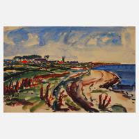 Blick entlang der Nordseeküste auf ein kleines Dorf unter blauem Himmel, Aquarell auf dünnem Papier, auf Passepartout in Blei rechts signiert und datiert „Erich Dieckmann 1929“ und links ausführlich betitelt „Landschaft bei St. Peter an der Nordsee, Schleswig“, Papier materialbedingt knitterspurig, Passepartoutausschnitt ca. 21,5 x 34,5 cm. Künstlerinfo: dt. Tischler, Hochschullehrer und Möbelentwerfer (1896 Kauernik/Westpreußen bis 1944 Berlin), 1918-20 Studium der Architektur an der technischen Hochschule Danzig, ab 1921 Studium am Bauhaus in Weimar und hier von 1921-24 Tischlerlehre, nach Weggang von Marcel Breuer wird Dieckmann kommissarischer Leiter der Möbelwerkstatt am Bauhaus, 1925-30 Leiter der Tischlerwerkstatt an der Bauhochschule Weimar, 1931-33 Tätigkeit als Leiter der Tischlerwerkstatt an der Kunstgewerbeschule Burg Giebichenstein, ab 1939 in Berlin ansässig, Quelle: Wikipedia und Internet.