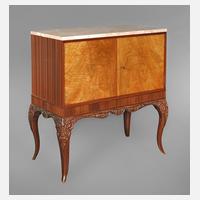 Italien, 1930er/40er Jahre, rückseitig Herstelleretikett Firma „Pozzi & Verga - Mariano Comense (Cantu), Mahagoni feinst geschnitzt, die Türen innen mit feiner colorierter Intarsie, originale Marmorplatte aus Veroneser Marmor, originaler Schlüssel, guter Zustand, Maße 86 x 80 x 42 cm.