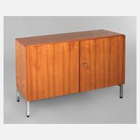 rückseitig gemarkt Planmöbel Eggersmann KG in Espelkamp, 1970er Jahre, in Teakholz furniert, innen in Weißbuche, Gestell aus verchromtem Stahlrohr, guter Zustand, Maße 68 x 115 x 41 cm.