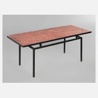 deutsch, 1960er Jahre, rechteckige Platte mit Glasmosaik in Rottönen, vereinzelt durchsetzt von goldenen Mosaiksteinen, Gestell aus schwarz lackiertem Eisen, Maße 51 x 118 x 47 cm.