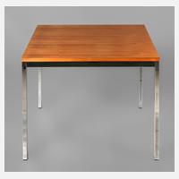 Hersteller Fa. Planmöbel, 1970er Jahre, verchromtes Stahlrohrgestell, quadratische Platte in Kirschbaum furniert, Z 2, Maße 70 x 78 x 78 cm.