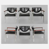 aus der 206 Serie von Team Form AG für Lübke, 1960er Jahre, an der Unterseite gemarkt, Gestell aus vernickeltem Stahlprofil, Armlehnen aus rotbraunem Tropenholz, Bezug aus schwarzem Leder, ein Sessel mit geschwärzten Originallehnen, guter Zustand, Maße 69 x 62 x 58 cm.