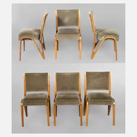 Entwurf Paul Bode 1955, "Federholz Stuhl", Produktion Deutsche Federholzgesellschaft, um 1960, unter Dampf gebogenes Gestell aus Buchenholz mit federnder Lehne, Bezüge aus grauem Samt, Alters- und Gebrauchsspuren, H 85 cm SH 49 cm.