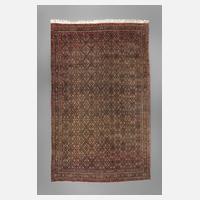 Iran, Mitte 20. Jh., komplett durchmustertes Mittelfeld, mehrteilige umlaufende Bordüre, stilisierter Floraldekor, Fransenbesatz gekürzt, leichte Altersspuren, Maße 214 x 134 cm.