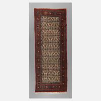 1. Hälfte 20. Jh., in kräftigem Kolorit gehaltene Galerie mit zentralem dreiteiligen Rautendekor, schmale umlaufende Bordüren, eine Schmalseite gekürzt, Altersspuren, Maße 246 x 124 cm.