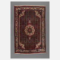 Iran, 2. Hälfte 20. Jh., komplett durchmustertes Mittelfeld, Zentralmedaillon und Eckzwickel mit stilisierten Rosenblüten, mehrteilige umlaufende Bordüre, Fransenbesatz gekürzt, Maße 198 x 134 cm.