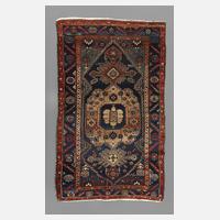1. Hälfte 20. Jh., in dunklem Kolorit gestaltet mit geometrischem sowie stilisiert floralem Dekor, Fransenbesatz gekürzt, Altersspuren, Maße 189 x 130 cm.