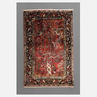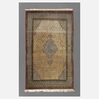 2. Hälfte 20. Jh., feiner Seidenteppich mit zentralem Motiv des sich windenden Lebensbaumes, gerahmt von zahlreichen Vogeldarstellungen, umlaufendes Schriftband, blütenverzierte Bordüren, Fransenbesatz gekürzt, Maße 154 x 97 cm.