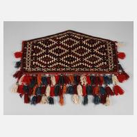 Mitte 20. Jh., cremefarbene Dessins über rostrotem Fond, rapportierendes Rautendekor und mehrteiliger Bordürenbereich, intakter Besatz, Maße 77 x 40 cm.