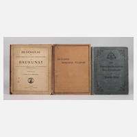 3 Stück: Die Praxis des modernen Maschinenbaues, von Ingenieur W. Häntzschel-Clairmont, ohne Jahr, vollständig, Einband mit Altersspuren. - Moderne Technik. Die wichtigsten Gebiete der Maschinentechnik und Verkehrstechnik, allgemeinverständlich dargestellt und erläutert durch zerlegbare Modelle, hrsg. von H. Blücher, Leipzig/Wien 1912, beim Tauchboot die Montierung knittrig, sonst vollständig und gut erhalten, Einband fleckig und bestoßen. - Dabei: Bildatlas zur Einführung in die Geschichte der Baukunst. Als Leitfaden zum Gebrauch an Bau- und Gewerbeschulen zusammengestellt, 6. Aufl., Leipzig 1903, 43 S., Einband mit Altersspuren.