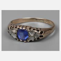 um 1880, Gelbgold gestempelt 585, sich leicht verbreiternde Ringschiene, besetzt mit einem Saphir und sechs Diamantrosen, Tragespuren, RW 17 mm, G ca. 1,9 g.