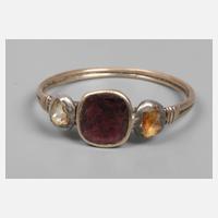 18. Jh., Gelbgold geprüft 585/1000, besetzt mit einem facettierten Rubin, flankiert von insgesamt zwei Diamantrosen, Tragespuren RW 17 mm, G ca. 1,1 g.