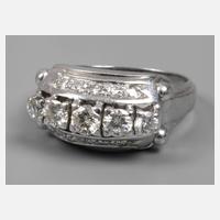 um 1980, Weißgold gestempelt 585, ca. 12 mm breiter Ringkopf, besetzt mit neun Brillanten von max. 0,25 ct, in Krappenfassung, minimale Tragespuren, RW 18 mm, G ca. 4 g.