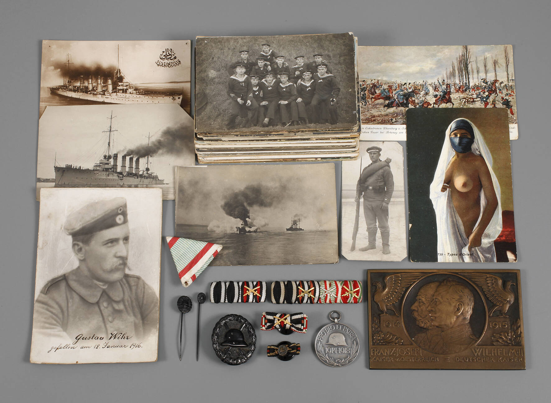 Erinnerungsplakette auf die Kaiser Wilhelm II. und Franz Joseph I. 1914/15 (Buntmetall, 8,5 x 13 cm), Verwundetenabzeichen in Schwarz, dazu zwei Miniaturen an Nadel, Kriegserinnerungsmedaille Österreich-Ungarn, zwei Interimsbandspangen sowie zwei Knopflochabzeichen, dazu Konvolut Postkarten.