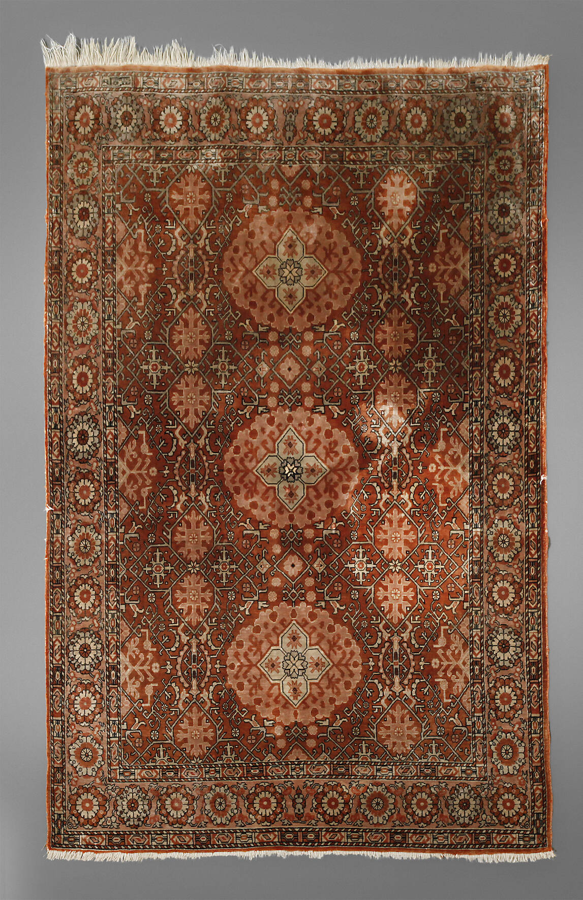 Mitte 20. Jh., feiner Seidenteppich, das Mittelfeld verziert von mehreren, verschieden großen Medaillons, gerahmt von Rankwerk und blütenverzierten, mehrteiligen Bordüren, von satter rostroter Farbigkeit mit hellen Akzenten, Fransenbesatz gekürzt, mit Zertifikat, minimale Altersspuren, Maße 80 x 116 cm.