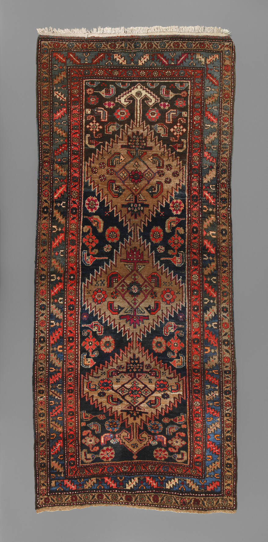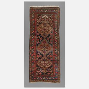 1. Hälfte 20. Jh., in kräftigem Kolorit gehaltene Galerie mit zentralem dreiteiligen Rautendekor, schmale umlaufende Bordüren, eine Schmalseite gekürzt, Altersspuren, Maße 246 x 124 cm.