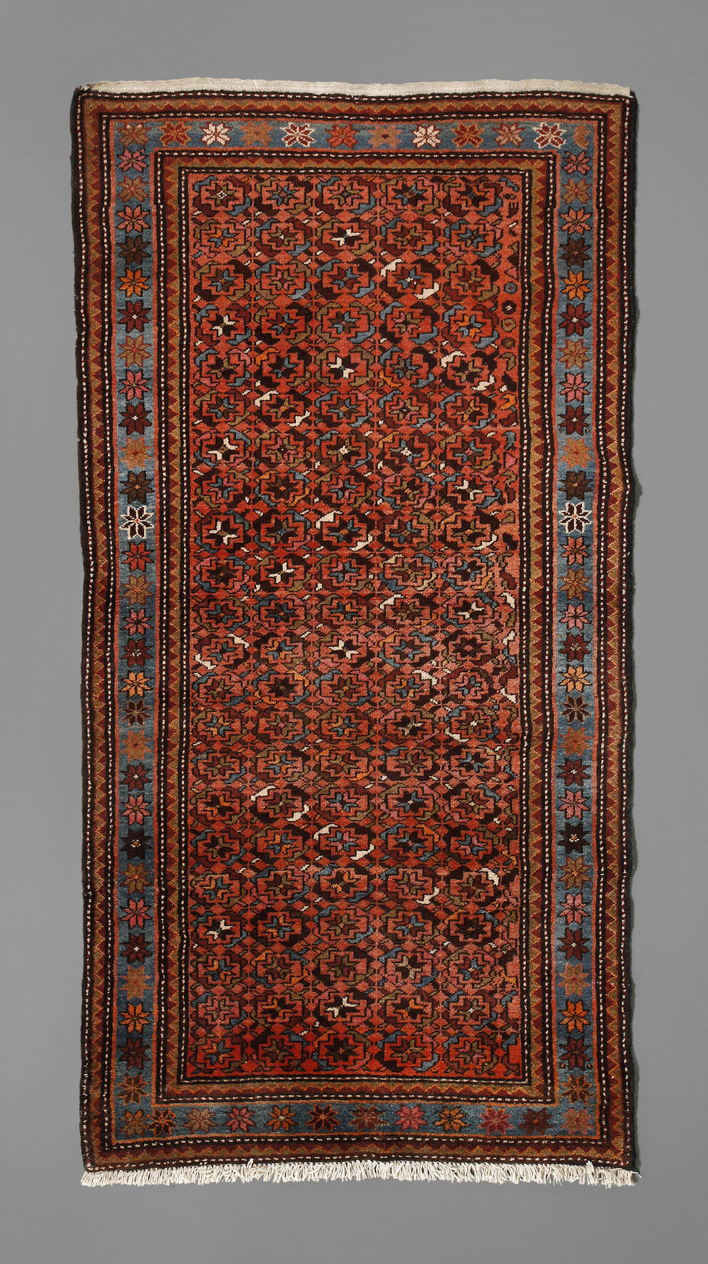 1. Hälfte 20. Jh., komplett durchmustertes Mittelfeld mit floral staffierten umlaufenden Bordüren in kräftigem Kolorit über rostrotem Fond, Fransenbesatz verkürzt, sonst guter Zustand, Maße 184 x 102 cm.