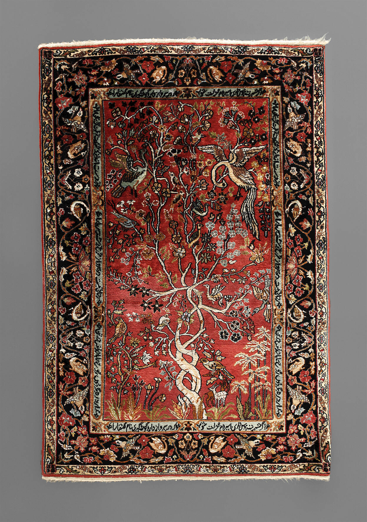 2. Hälfte 20. Jh., feiner Seidenteppich mit zentralem Motiv des sich windenden Lebensbaumes, gerahmt von zahlreichen Vogeldarstellungen, umlaufendes Schriftband, blütenverzierte Bordüren, Fransenbesatz gekürzt, Maße 154 x 97 cm.