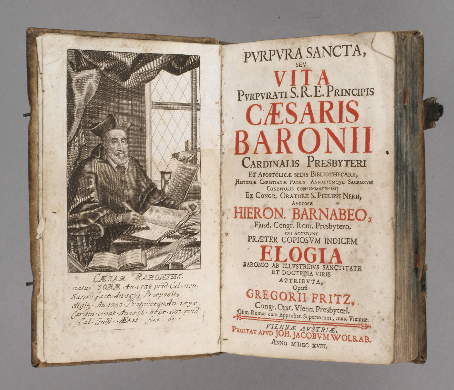 Cardinalis Presbyteri [...] Auctore Hieron. Barnabeo [...] cui accedunt praeter copiosum indicem Elogia baronio ab illustribus sanctitate et doctrina viris attributa, operâ Gregorii Fritz, Wien 1718, Format Kl. 8°, 10 Blatt, 274 S. und 13 Blatt, ein Kupferfrontispiz, Cesare Baronio zeigend, Pergamenteinband, Rücken beschriftet, Schließen intakt, altersgemäß schöner Zustand.