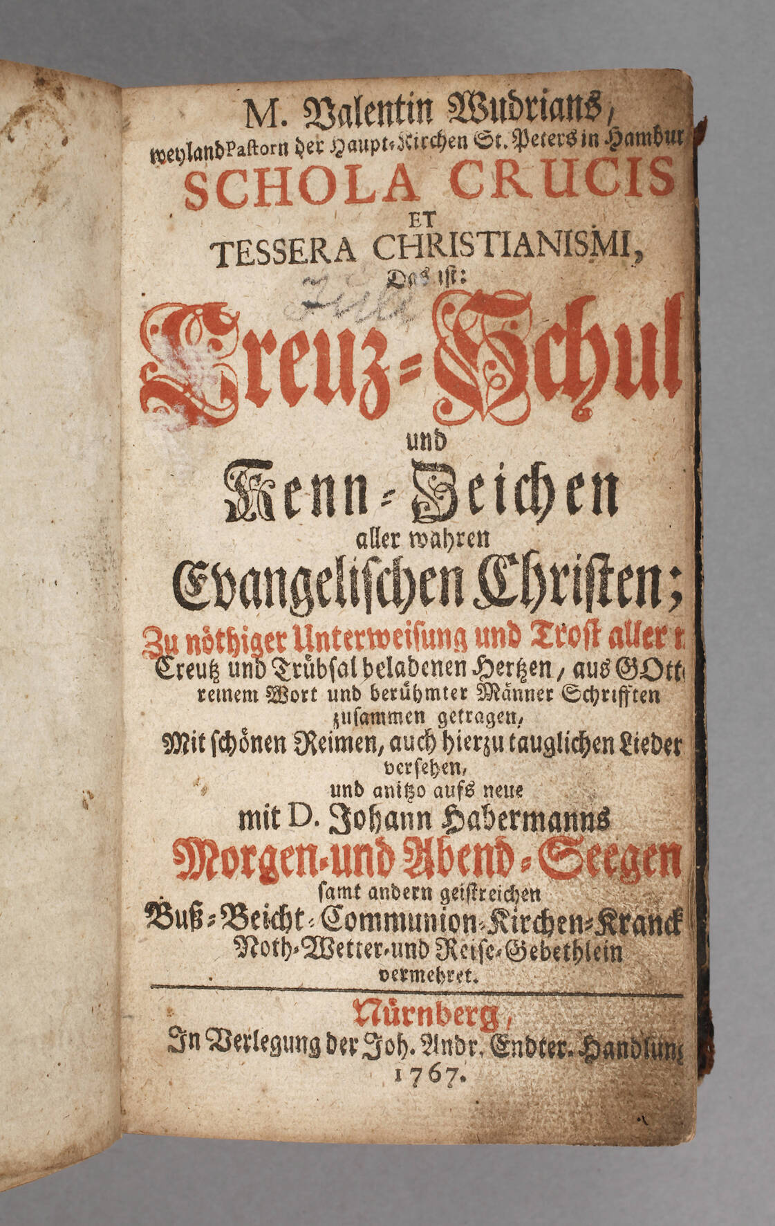 et tessera christianismi, das ist: Creuz-Schul und Kenn-Zeichen aller wahren Evangelischen Christen [...] und anitzo aufs neue mit Johann Habermanns Morgen- und Abend-Seegen [...] vermehret, Nürnberg 1767, Format Kl. 8°, 652 und 62 S., einige Kupfer, Halbledereinband, altersgemäßer Zustand.