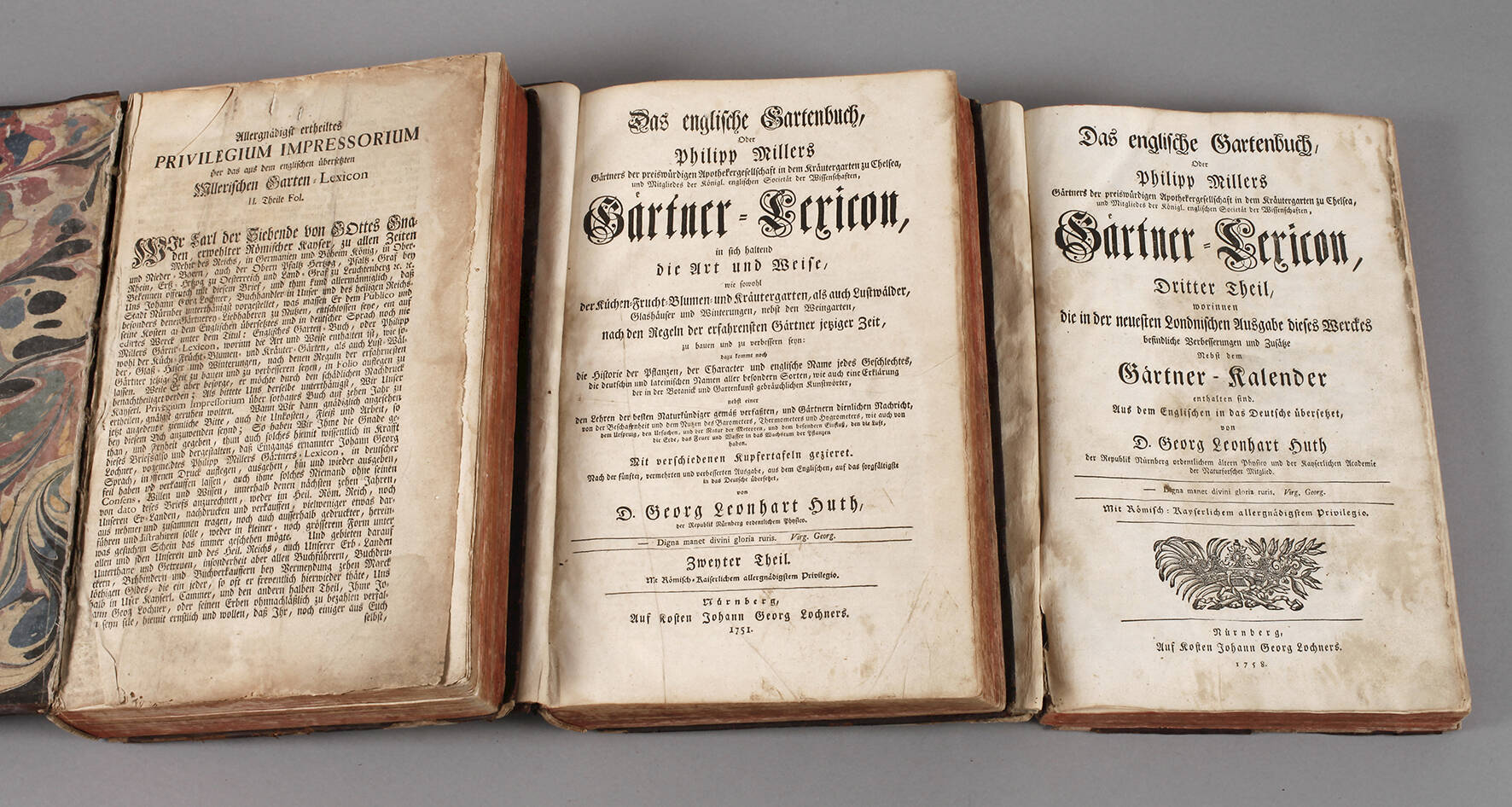 oder Philipp Millers, Gärtners der preiswürdigen Apothekergesellschaft in dem Kräutergarten zu Chelsea und Mitgliedes der Königl. englischen Societät der Wissenschaften, Gärtner-Lexicon, in sich haltend die Art und Weise wie sowohl der Küchen-Frucht-Blumen- und Kräutergarten, als auch Lustwälder, Glashäuser und Winterungen, nebst den Weingarten, nach den Regeln der erfahrensten Gärtner jetziger Zeit, zu bauen und zu verbessern seyn [...] mit verschiedenen Kupfertafeln gezieret, nach der fünften, vermehrten und verbesserten Ausgabe, aus dem Englischen, auf das sorgfältigste in das Deutsche übersetzt von Georg Leonhart Huth, 3 Teile, Nürnberg 1751/1758, Format Gr. 4°, 548/620/336/63 S., Titelseite des 1. Teils fehlt, die Vorsätze mit Feuchtigkeitsschäden, sonst gut erhalten, Teil 1 mit 5, Teil 2 mit 6 Kupfern.
