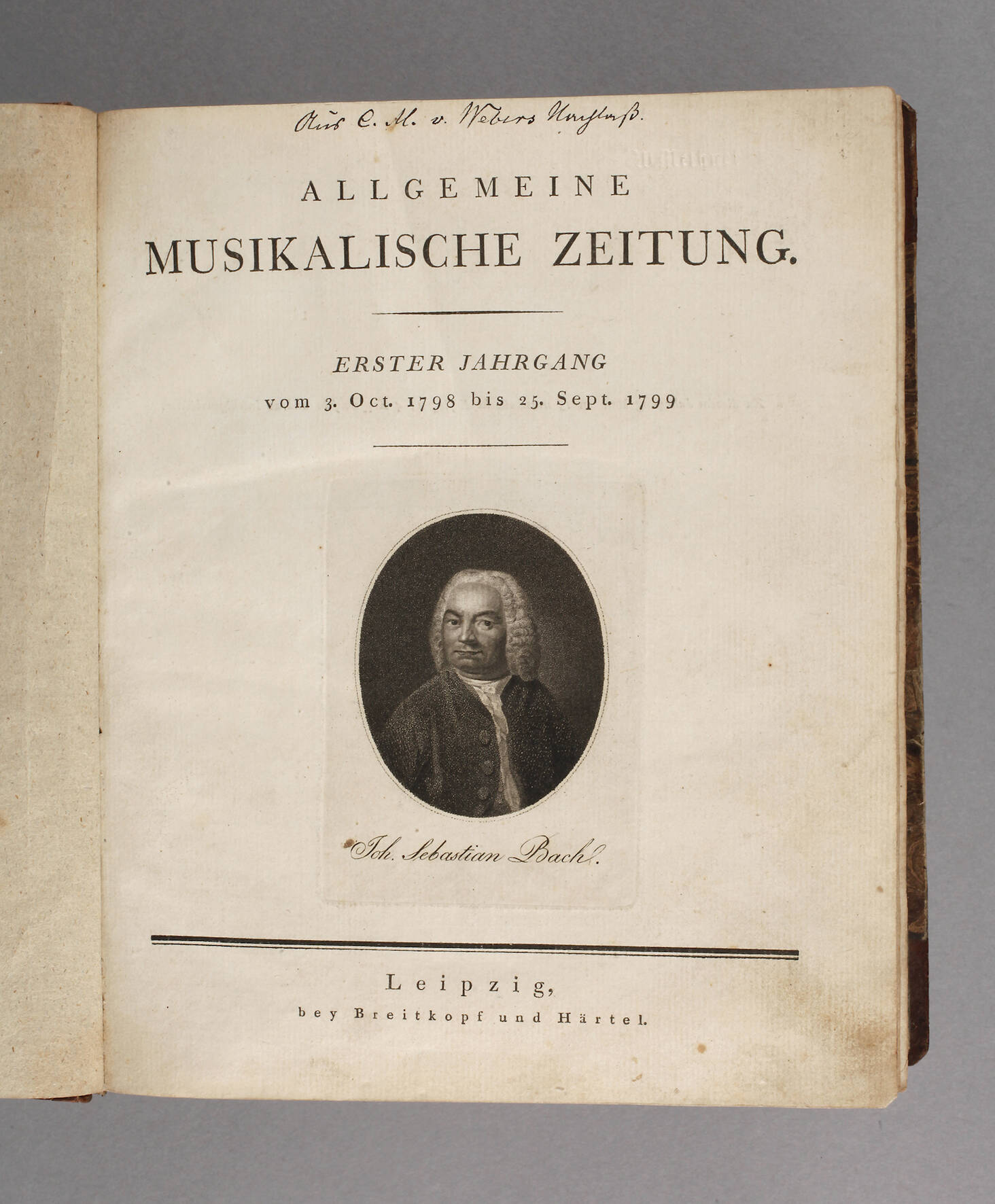 1. Jahrg. vom 3. Oct. 1798 bis 25. Sept. 1799, Leipzig bei Breitkopf und Härtel, auf dem Titelblatt handschriftlich bezeichnet "Aus C. M. v. Webers Nachlaß", Vorsatz mit Blindstempel "W. Methner", 888 S., mit einem Titelkupfer Johann Sebastian Bachs, Halbledereinband mit Rückenschildchen, altersgemäß schön erhalten, dabei handschriftliches Notenblatt "Fischleins Wohl und Weh" von Sydow und Tiedemann.