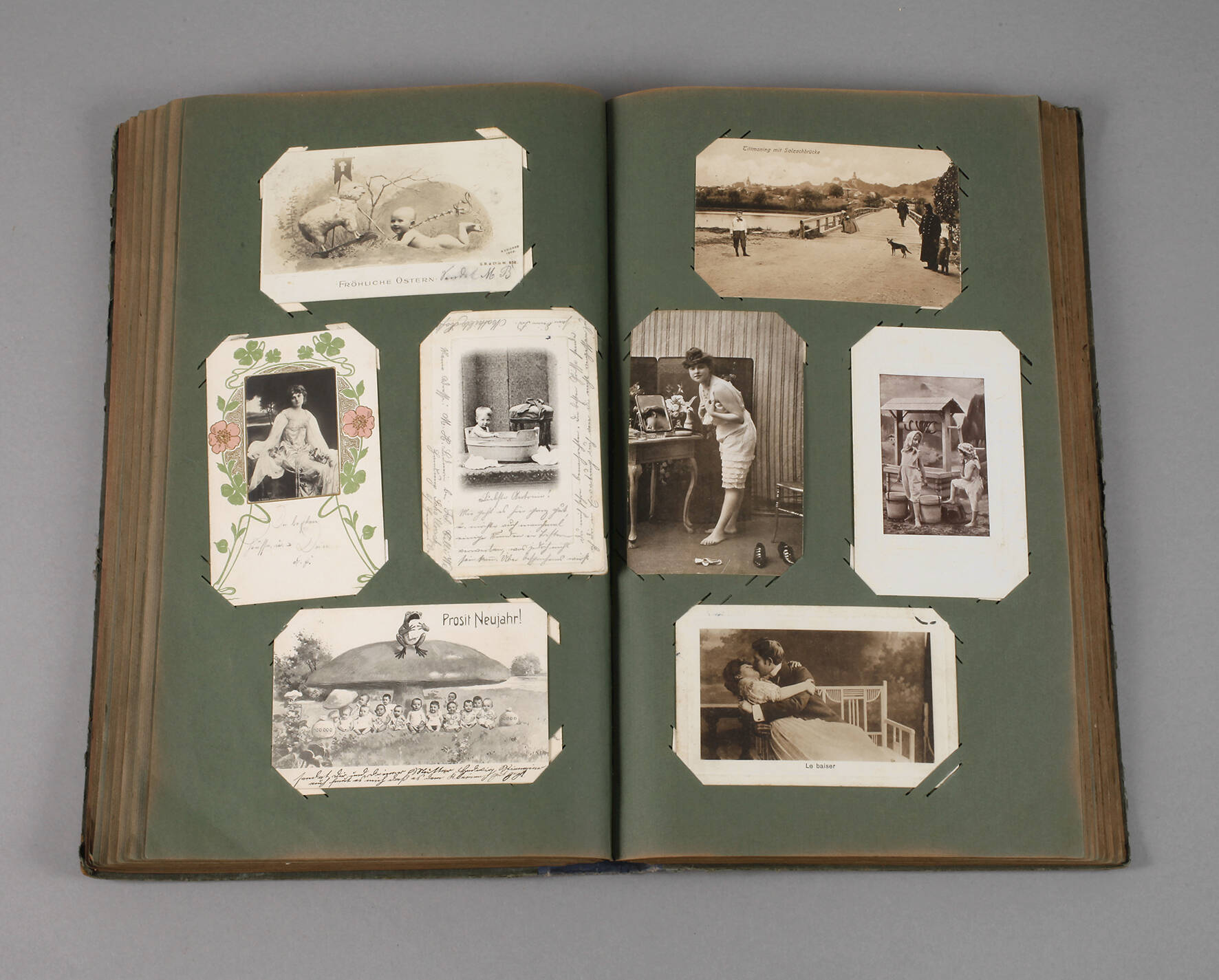 um 1910, ca. 600 Kitsch-, Serien- und Grußkarten, in Jugendstilalbum, Maße ca. 41 x 24,5 cm.