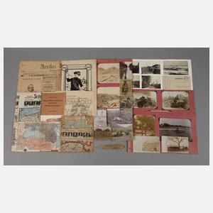 montierte Fotografien Galizien 1916, studentische Zeitung "Weihnachtskneipe 1901", Festzeitung zum 12. Stiftungsfest der techn. Verbindung Frankonia 1918, einige Landkarten und koloniale Fotos, normale Altersspuren.