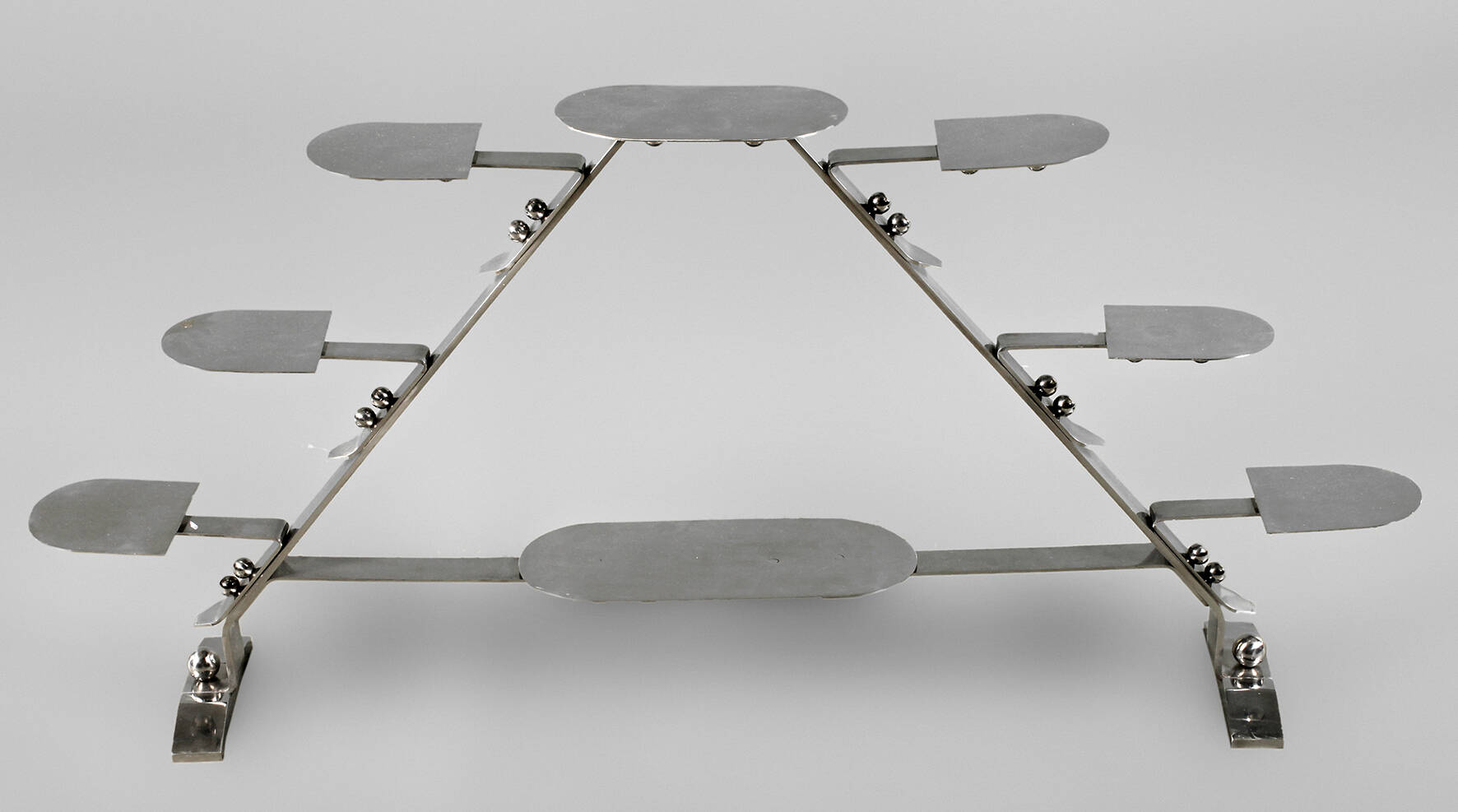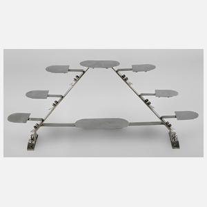 wohl 1930er Jahre, verchromtes Metallgestell, mehrteilig verschraubt, die Schraubenköpfe in Kugelform, guter Zustand, Maße 56 x 120 x 12 cm.