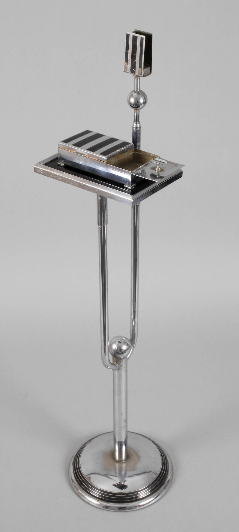 1920er Jahre, ungemarkt, verchromtes Metall, teils geschwärzt, profilierter Rundfuß mit zweiarmigem Gestänge, mit Streichholzschachtelhalter und schmalem Tableau, dazugehöriges Zigarettenetui mit integriertem Ascher, Alters- und Gebrauchsspuren, H 83 cm.