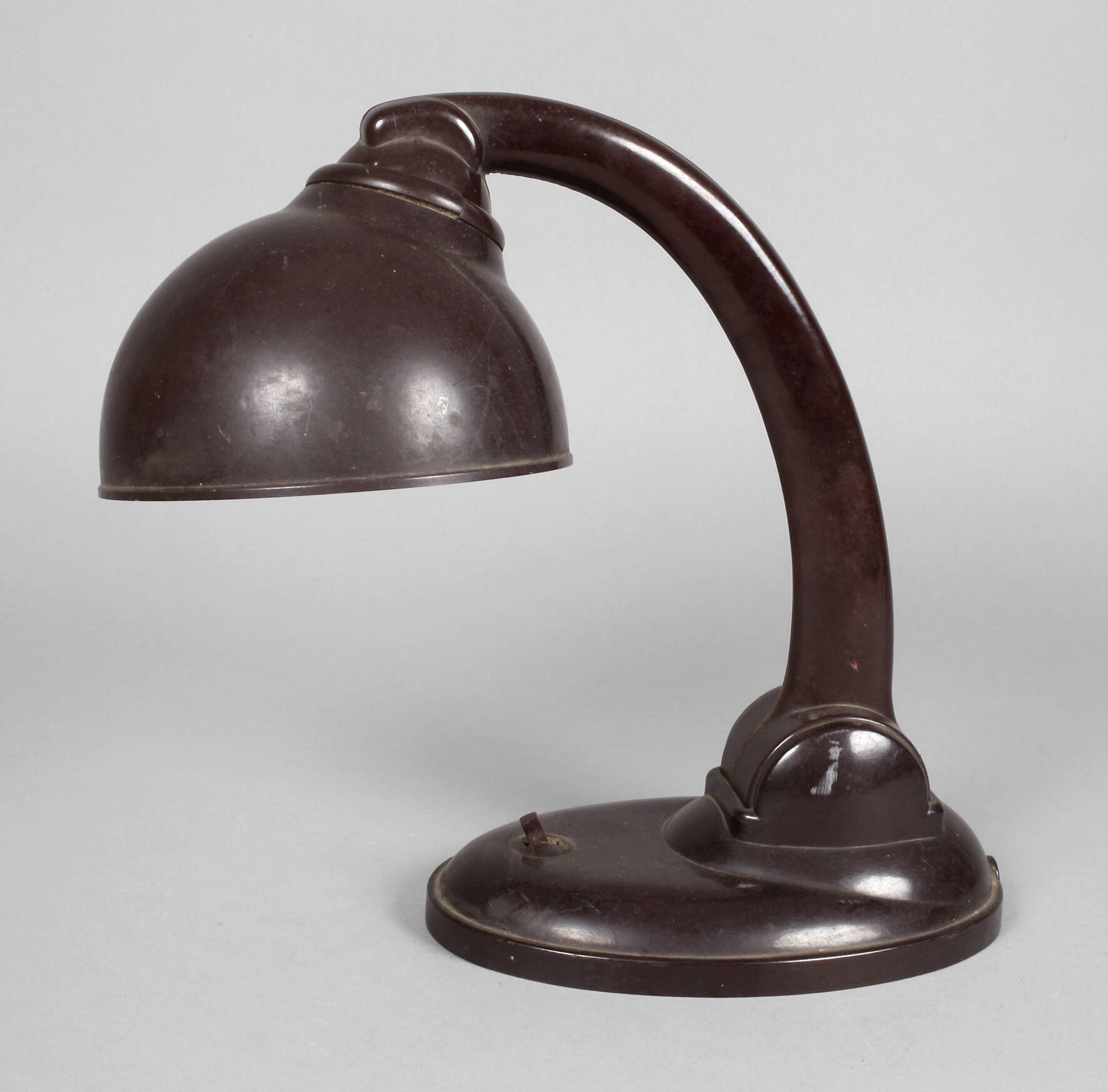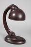 1930er Jahre, gemarkt Pat. 42670, Gehäuse aus dunkelbraunem Bakelit, ovaler Fuß mit neigbarem, c-förmigem Leuchterarm, variabel platzierbarer Schirm, einflammig elektrifiziert, Elektrik rest.bed., Altersspuren, H 37 cm.