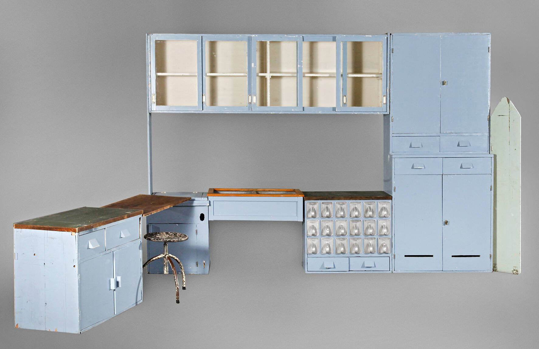 Ausführung Grumbach, für das städtische Hochbauamt Frankfurt, Weichholz-Rahmenkonstruktion, taubenblau lackiert, verschiedene Holzarten, in der ursprünglichen blauen Farbfassung rekonstruiert und teils restauriert, mit originalem Gusseisen-Doppelspülbecken, allen Schränken, Arbeitsplatte sowie Alu- und Holzschütten vorhanden, Höhe ca. 215 cm. Info: Exemplar einer originalen Frankfurter Küche aus der Ernst May-Siedlung Römerstadt, Frankfurt. Gesamtplanung: Ernst May, Herbert Brehm und Wolfgang Banger. "Abteilung Typisierung" des städtischen Hochbauamtes Frankfurt, u. a. zuständig für die Entwicklung der Frankfurter Küche: Margarete Schütte-Lihotzky.