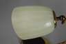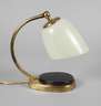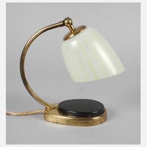 1960er Jahre, Ausführung GMF Gotha, vergoldetes Messinggestell, der ovale Fuß mit großer Taste aus geschwärztem Kunststoff, c-förmiger Leuchterarm, variabel neigbarer Schirm aus streifig grün überfangenem, satiniertem Klarglas, einflammig, alt elektrifiziert, Alters- und Gebrauchsspuren, H 25 cm.