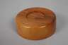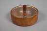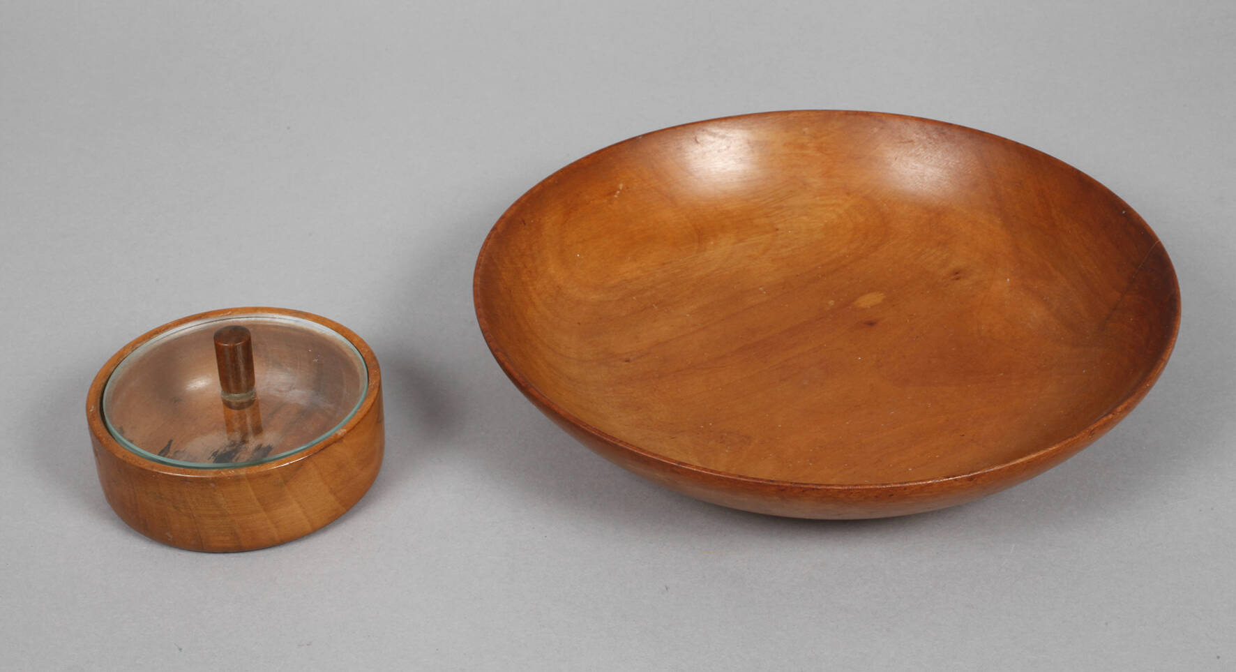 in der Art von Eberhard Schrammen, um 1925, ungemarkt, Obstholz klar lackiert, schlichte gemuldete Schale und flache Runddose mit aufgelegtem, abnehmbarem Flachdeckel aus Klarglas mit zylindrischem Holzknauf, min. Altersspuren, D 9 und 22 cm.