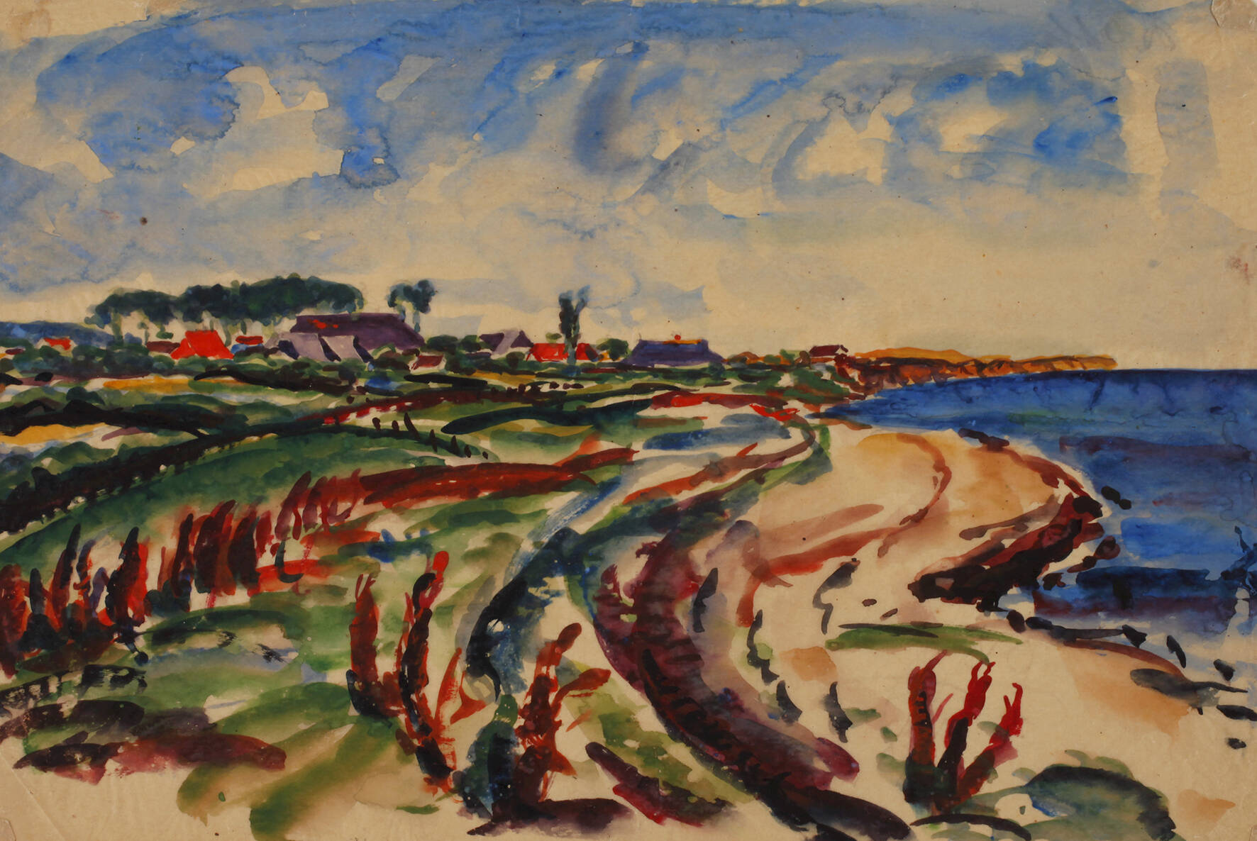 Blick entlang der Nordseeküste auf ein kleines Dorf unter blauem Himmel, Aquarell auf dünnem Papier, auf Passepartout in Blei rechts signiert und datiert „Erich Dieckmann 1929“ und links ausführlich betitelt „Landschaft bei St. Peter an der Nordsee, Schleswig“, Papier materialbedingt knitterspurig, Passepartoutausschnitt ca. 21,5 x 34,5 cm. Künstlerinfo: dt. Tischler, Hochschullehrer und Möbelentwerfer (1896 Kauernik/Westpreußen bis 1944 Berlin), 1918-20 Studium der Architektur an der technischen Hochschule Danzig, ab 1921 Studium am Bauhaus in Weimar und hier von 1921-24 Tischlerlehre, nach Weggang von Marcel Breuer wird Dieckmann kommissarischer Leiter der Möbelwerkstatt am Bauhaus, 1925-30 Leiter der Tischlerwerkstatt an der Bauhochschule Weimar, 1931-33 Tätigkeit als Leiter der Tischlerwerkstatt an der Kunstgewerbeschule Burg Giebichenstein, ab 1939 in Berlin ansässig, Quelle: Wikipedia und Internet.