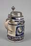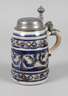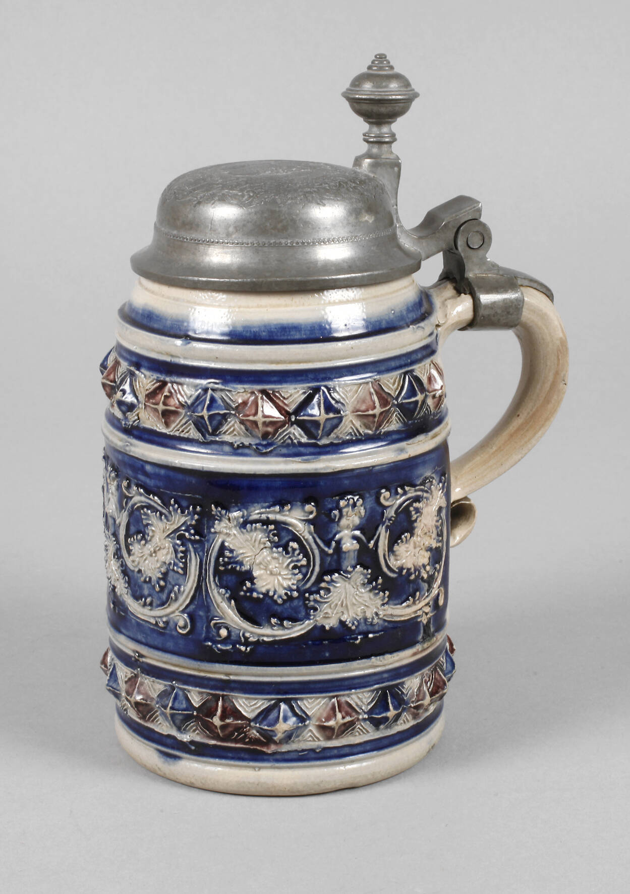 um 1650, graues Steinzeug salzglasiert, in Blau und dunklem Violett bemalt, mittig ein aufgemodelter Fries mit stilisierten Figuren und Rollwerk mit Blättern, darüber und darunter ein Band aus Diamantquadern, übergreifender Zinndeckel später ergänzt, feinst graviert, mittig ein Engel mit Krug, auf einer Wolke sitzend, umgeben von Früchtegirlanden, am Henkelansatz minimalst brandfleckig, sonst sehr schöner Originalzustand ohne Beschädigungen, H 21 cm.