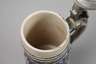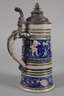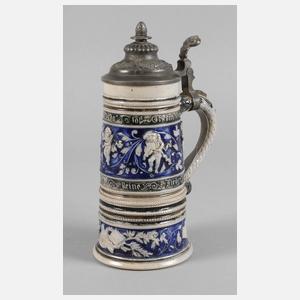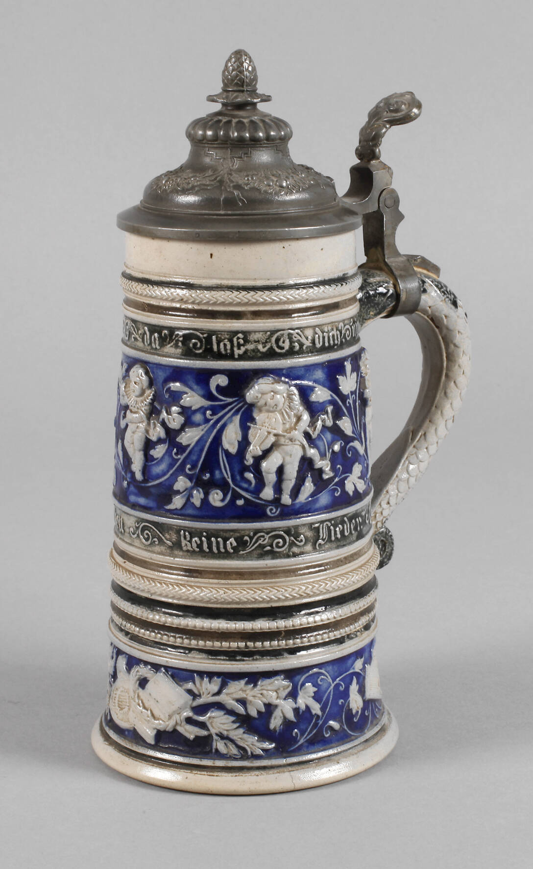Westerwald, um 1880, graues Steinzeug salzglasiert, kobaltblau und in dunklem Grau bemalt, Aufschrift "Wo man singt, da lass dich nieder, böse Menschen haben keine Lieder", reliefierte musizierende Putten zwischen Rollwerk, reliefierter Zinndeckel, beim Anheben ertönt die Melodie „An der schönen blauen Donau“ von Johann Strauß, funktionstüchtig, am Stand zwei unbedeutende kleine Haarrisse, H 23,5 cm.