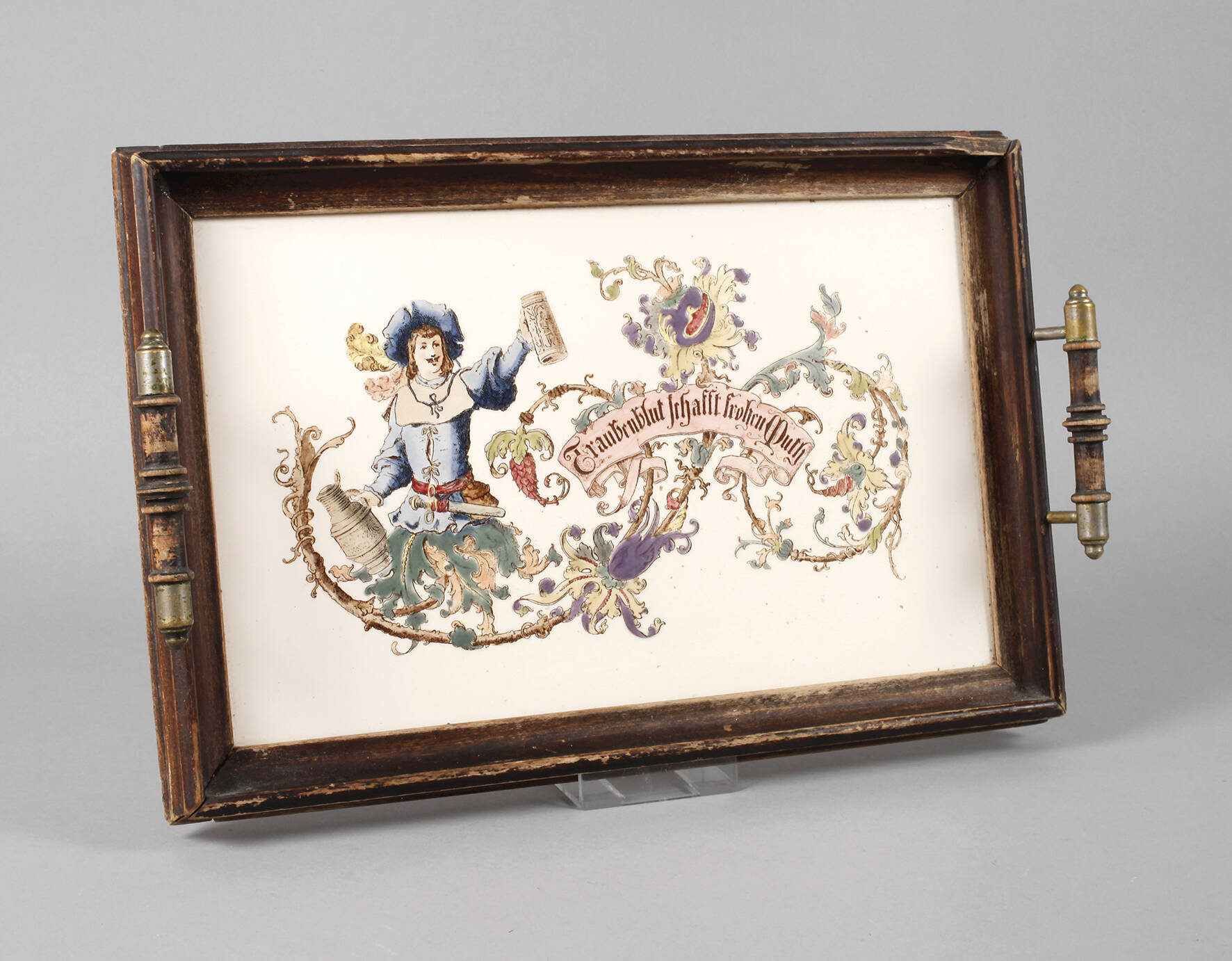 um 1880, ungemarkt, farbenfroh bedruckt, Ritterszene mit Rollwerk und Spruch "Traubenblut schafft frohen Muth", gebeizter Holzrahmen mit gedrechselten Henkeln, die Messingabschlüsse mit Resten alter Versilberung, Fehlstelle am Rand, Gebrauchs- und Altersspuren, L 43 cm.